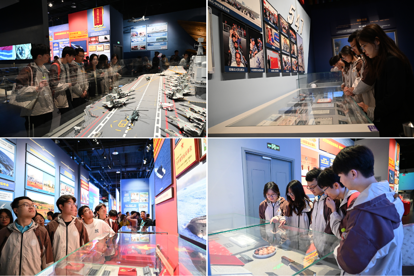 在90分钟的专业团队讲解中,同学们循着历史的脉络走进一楼中国海军历史展厅,从鸦片战争时期的海上屈辱,到新时代人民海军的向海图强,一幅幅珍贵史料、一段段厚重历史,让大家深刻感悟到人民海军从无到有、从小到大、从弱到强的奋斗精神。步入二楼海洋科技与装备展厅,参观内容与化工专业实现深度衔接。当讲解员介绍舰艇特种钢材研发、动力燃料优化、海洋防腐技术应用等内容时,同学们纷纷表示,真切看到了课本里的“化工原理”“材料科学”如何转化为支撑大国重器的“硬核科技”,专业认同感与报国使命感油然而生。