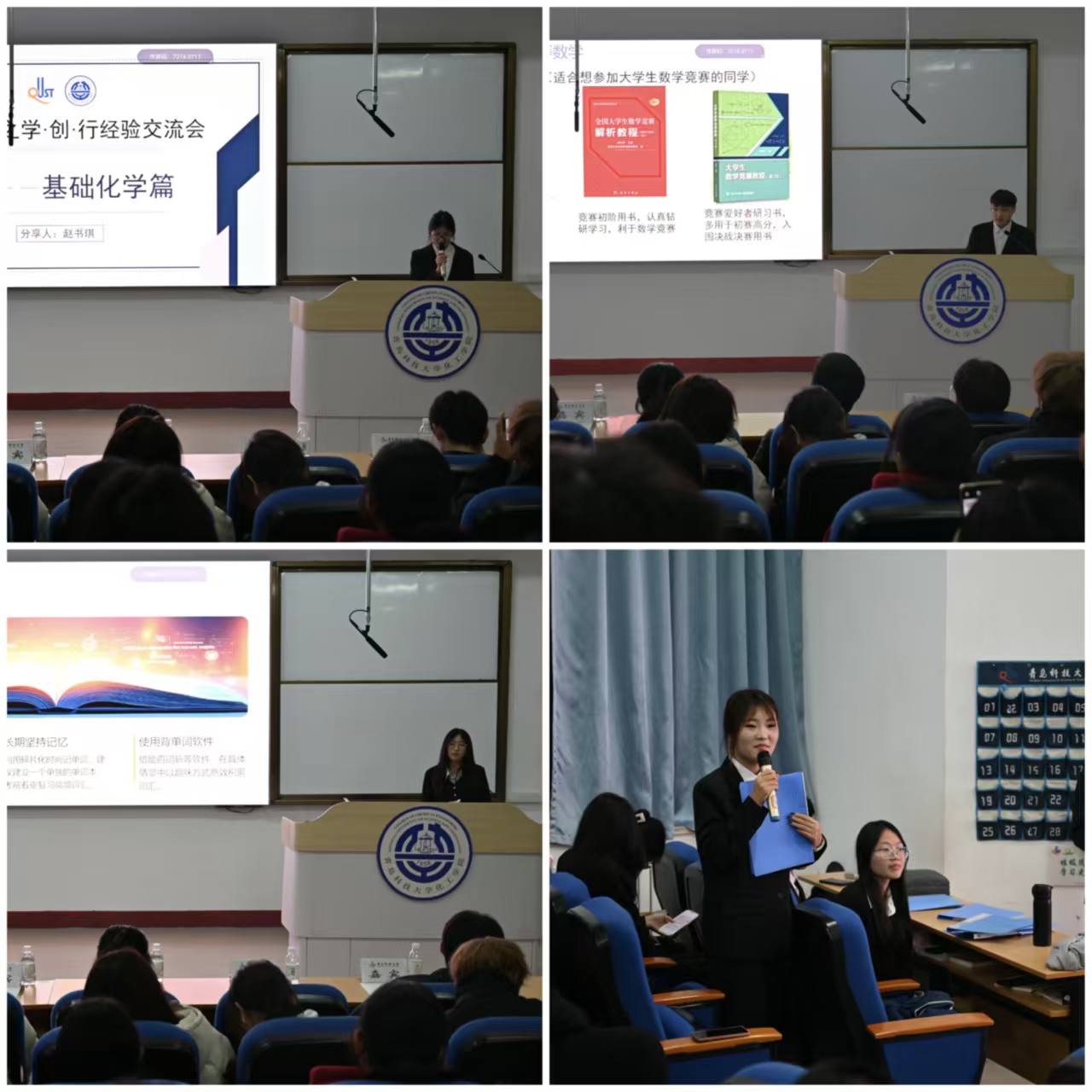 本次交流会以“学思践悟启新智,创行致远筑华章”为主题,设置主题介绍、经验分享与互动交流等环节。活动伊始,主持人对“飞跃论坛”系列活动背景及本次论坛安排作简要说明,引导同学们明确参与重点。随后,多位受邀优秀学长、学姐结合自身学习经历,围绕高等数学、基础化学、线性代数、大学英语等基础课程,从课堂听讲与重点把握、笔记整理与知识框架搭建、复习节奏安排、资料选择以及错题归纳等方面分享实用方法,并就阶段性考试准备、学习效率提升与学习心态调整提出具体建议。