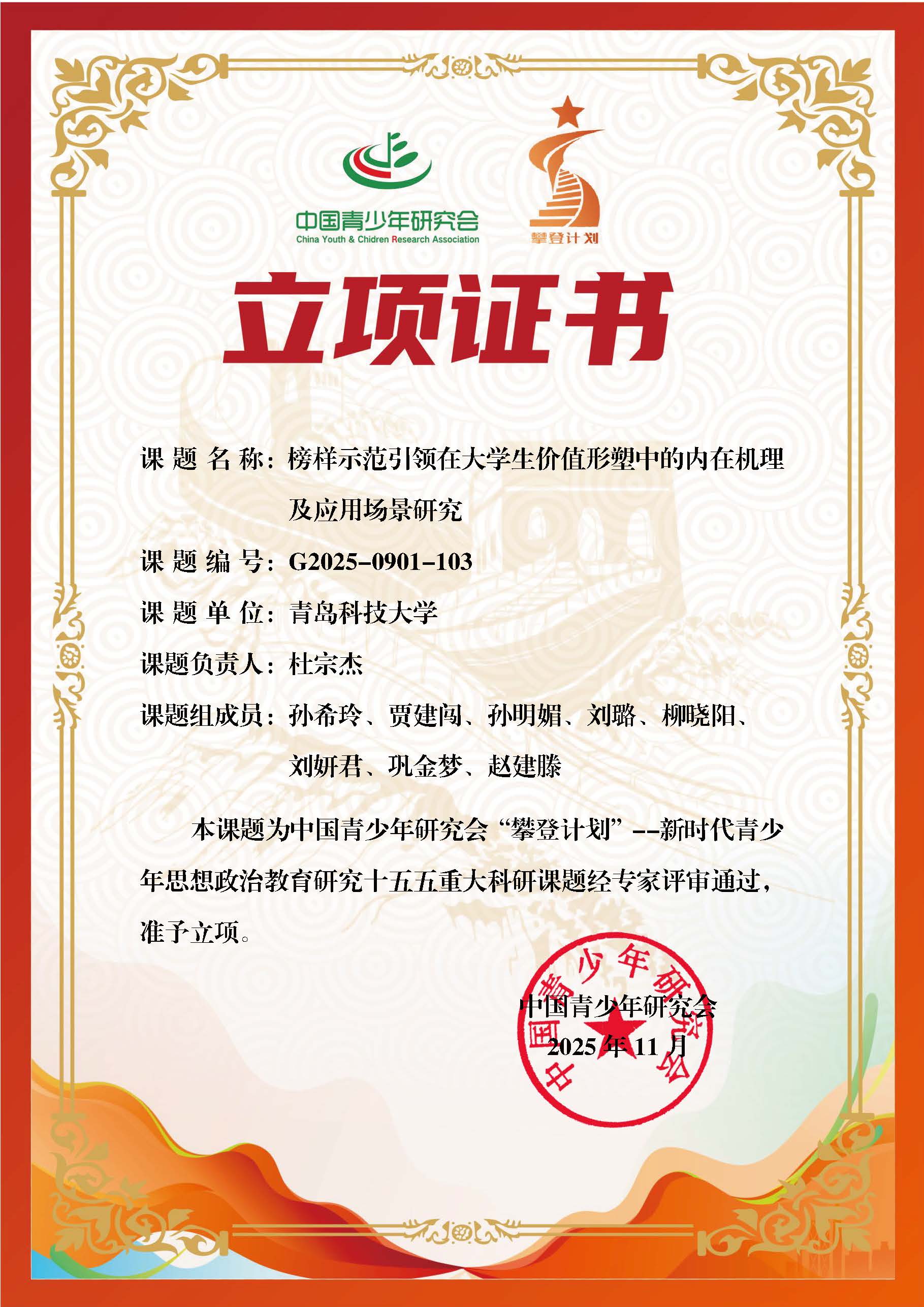 11月19日-23日,由中国青少年研究会组织“攀登计划”--新时代青少年思想政治教育研究暨“十五五”开题立项培训会在上海市召开。会议上公布了“攀登计划”--新时代青少年思想政治教育研究“十五五”重大科研课题经立项名单,bbin连环夺宝官网杜宗杰申报的《榜样示范引领在大学生价值形塑中的内在机理及应用场景研究》获批立项。