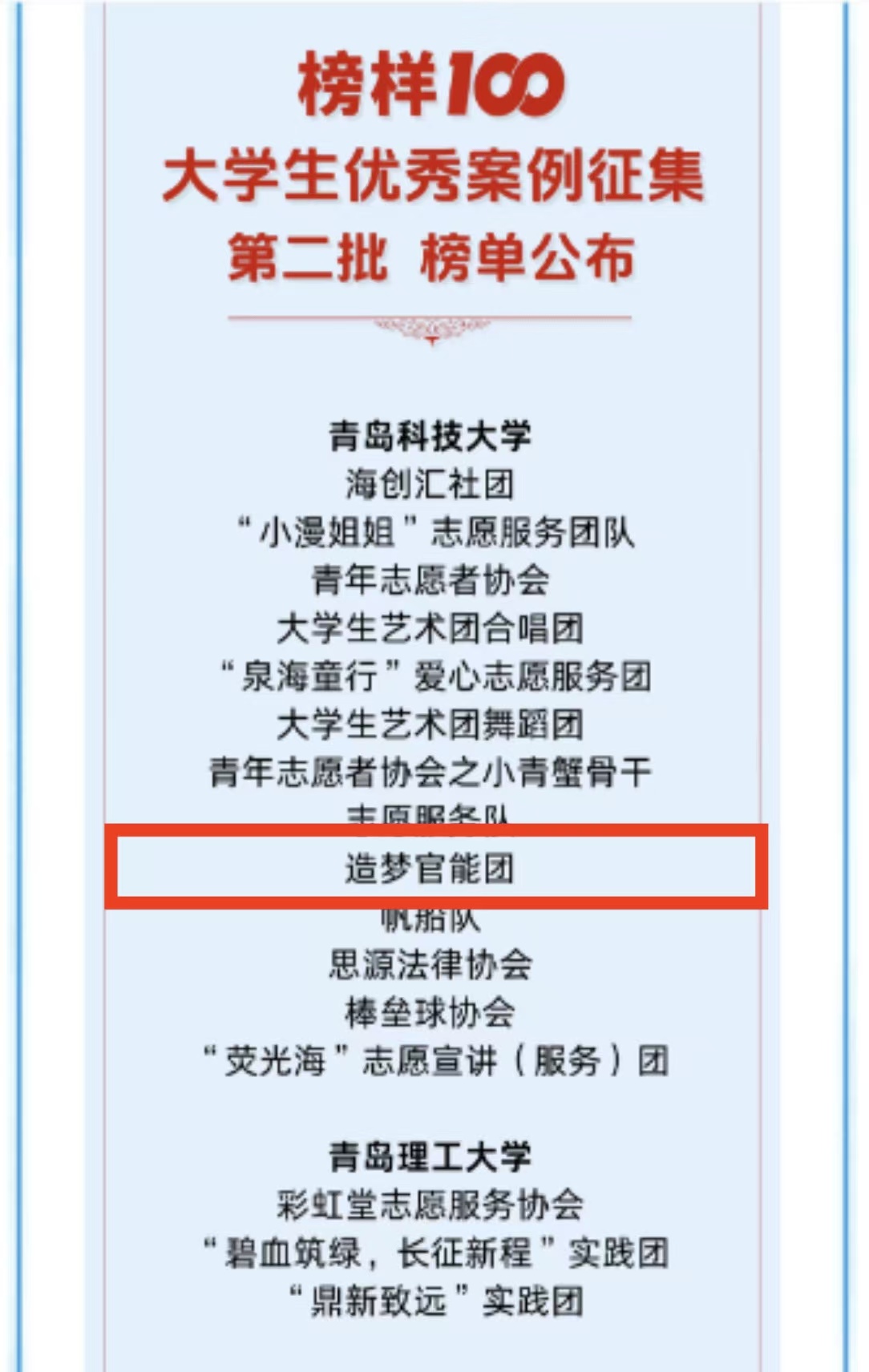 据悉,“中国大学生知行促进计划”是由团中央指导发起的大学生社会实践支持促进项目,“榜样100”全国优秀大学生社团由中国大学生知行促进计划、青年影响力创新中心联合发布,旨在评选和表彰优秀学生社团,挖掘社团榜样,提升学生社团影响力,助力大学生成长成才。
