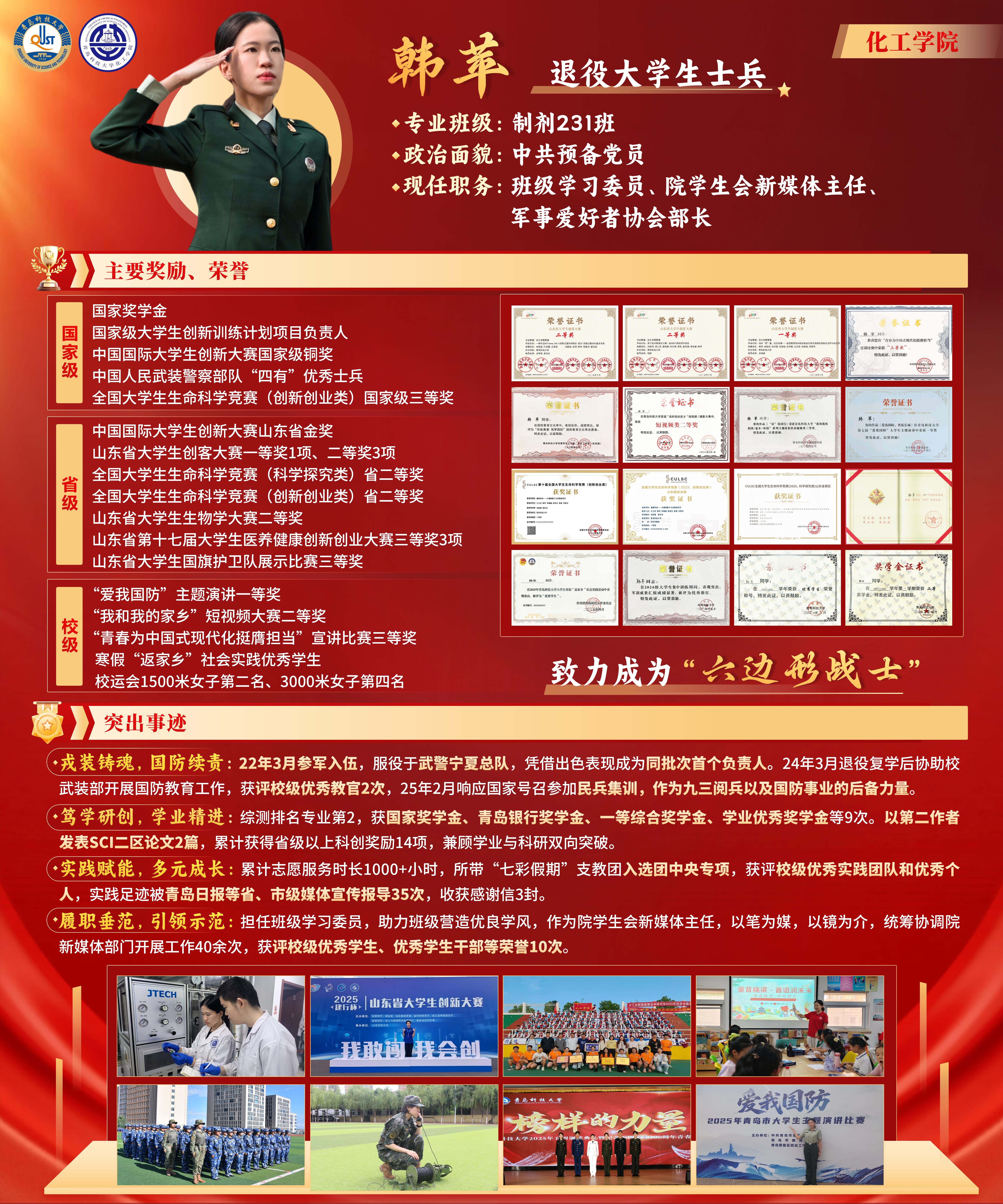 戎装铸魂,国防续责。22年3月参军入伍,服役于武警宁夏总队,凭借出色表现成为同批次首个负责人。24年3月退役复学后协助校武装部开展国防教育工作,获评校级优秀教官2次,25年2月响应国家号召参加民兵集训,作为九三阅兵及国防事业的后备力量。