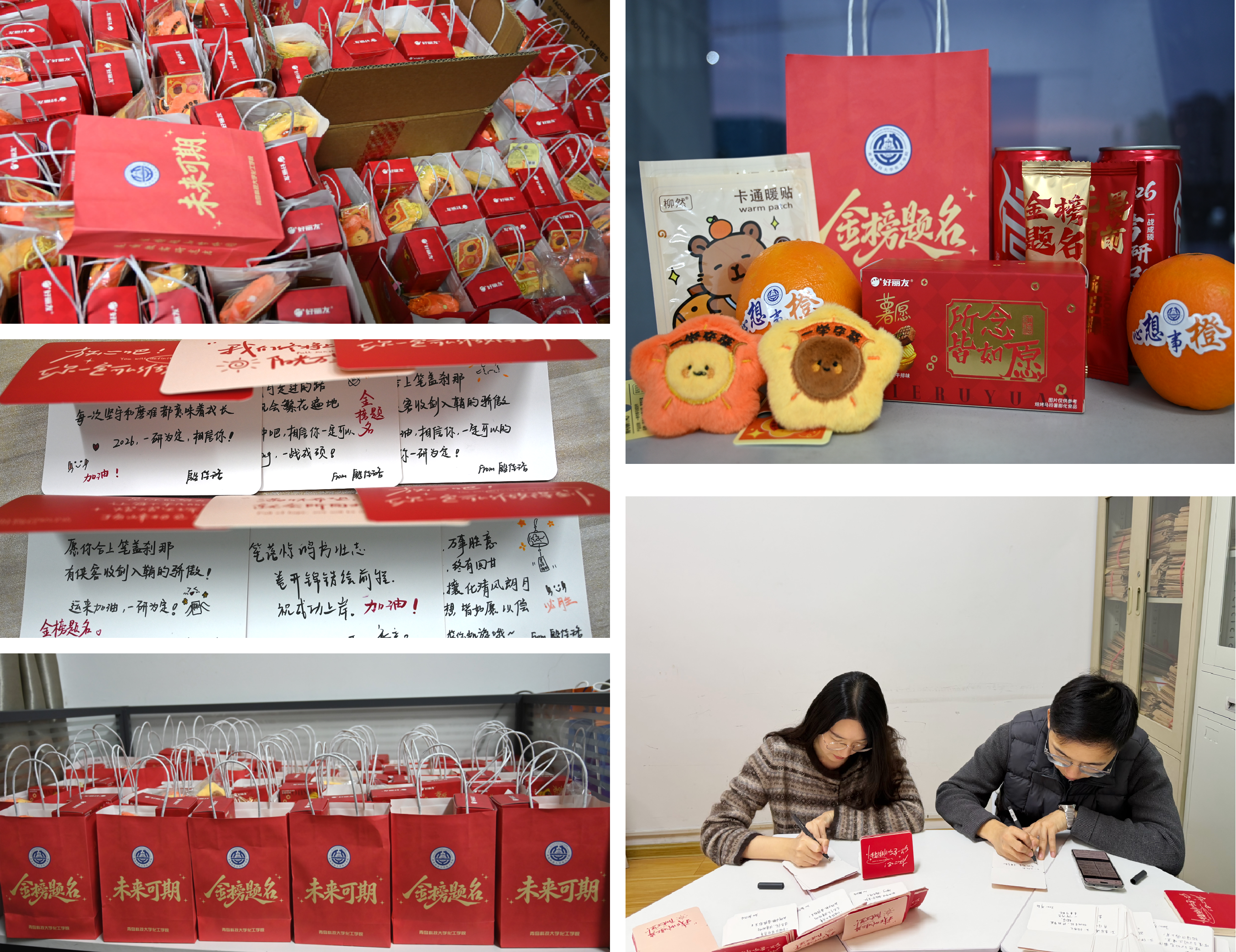 老师们为2026届考研学子发放“考研暖心礼包”,每一份都寄托着学院的美好期望与细致关怀:辅导员老师手写祝福卡、印刻姓名的定制可乐、寓意“心想事成”的新鲜橙子、“一举夺魁”毛绒挂饰、实用的卡通暖贴、印刻祝福语的能量零食包与棒棒糖,让这份礼包既具实用价值,又成为备考冲刺的“精神能量包”。