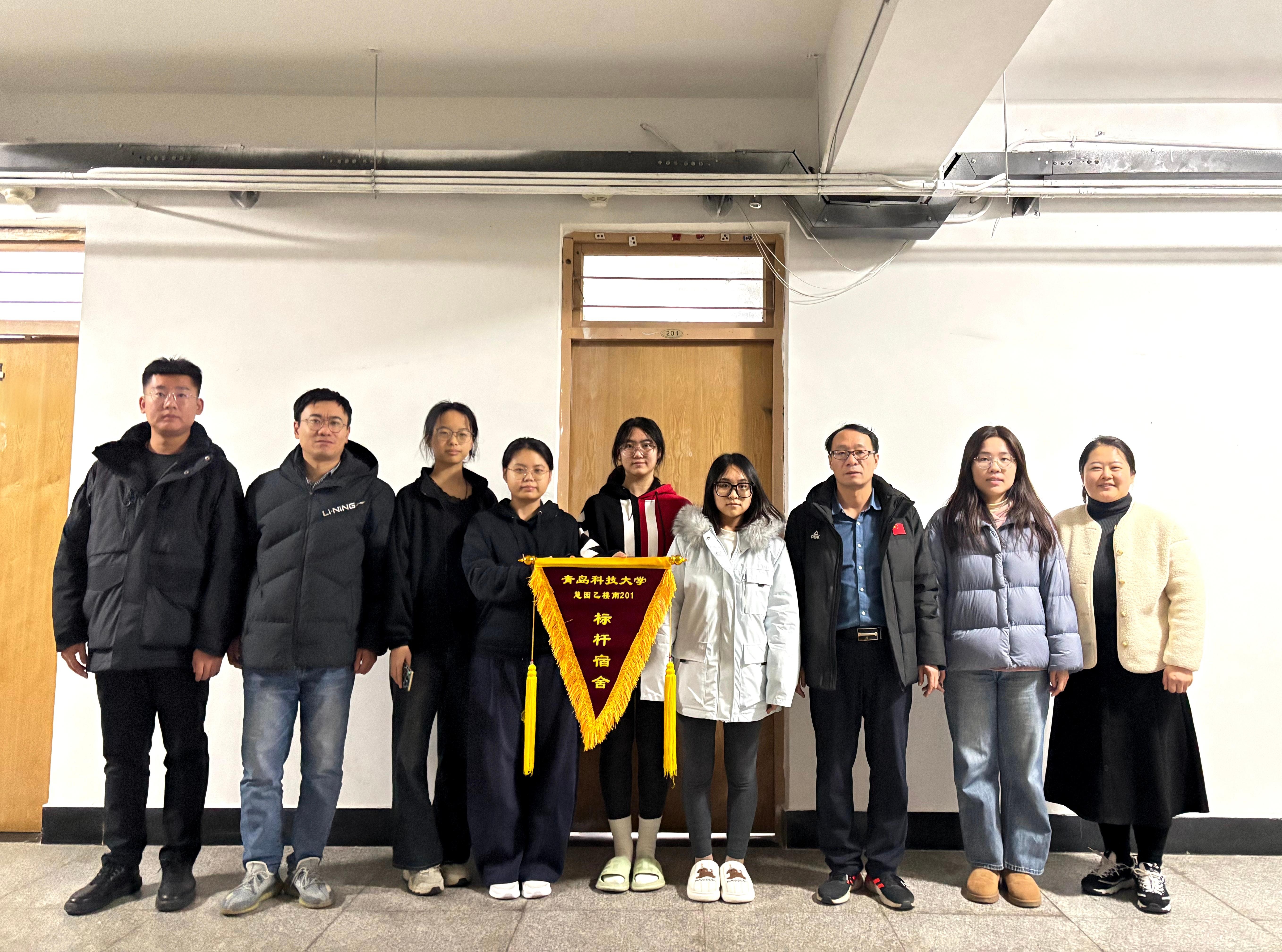 为深入落实学校宿舍管理与服务工作相关要求,表彰先进典型,发挥标杆引领作用,进一步深化学院宿舍育人阵地建设,12月15日下午,bbin连环夺宝官网在慧园乙南宿舍楼举行学校“标杆宿舍”锦旗授予悬挂活动。学院党委副书记兼副院长贾建闯、学工办主任兼团委书记杜宗杰,辅导员于文倩、李颖、宋伟国、赵建滕及获评宿舍全体成员参加活动。