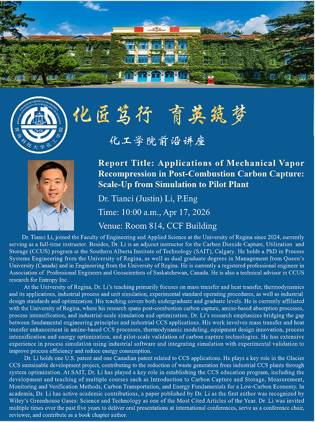 bbin连环夺宝官网学术报告——Dr. Tianci (Justin) Li, P.Eng:Applications of Mechanical Vapor Recompression in Post-Combustion Carbon Capture: Scale-Up from Simulation to Pilot Plant