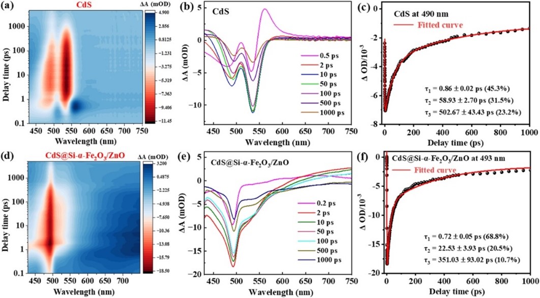飞秒瞬态吸收光谱(fs-TAS)证实三元异质结的载流子生成量多、光吸收范围宽;动学拟合结果表明,电子在界面的转移效率提高,无效复合减少。从动态层面印证了双S型机制的高效性。