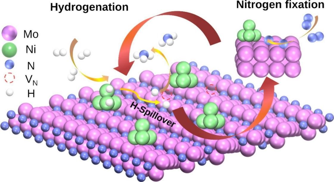 设计了一种基于Ni-Mo2N的复合氮载体(Guan, et al.J. Catal.2026, 454:116651),实现高效化学链制氨(CLAS)。复合载体Ni-Mo2N表现出卓越性能,是纯Mo2N的3倍。研究明确了Ni的双重作用机制:一方面,Ni作为氢化活性位点,显著增强H2的吸附与解离能力,并通过氢溢流效应促进H与Mo2N表面晶格氮的接触反应;另一方面,Ni与Mo之间存在电子转移作用,加速晶格氮迁移与转化。前期工作中,发现25wt%Ni掺杂VN使晶格氮转化率从3.3%跃升至49.2% (Han, et al.J. Cleaner Prod.2025, 494:145026);16wt%Ni负载Mn4N则将氨产率提升4倍,并将氨生产起始温度从550℃降至350℃,实现低温活性突破(Xue, et al.Sep. Purif. Technol.2025, 359:130829)。