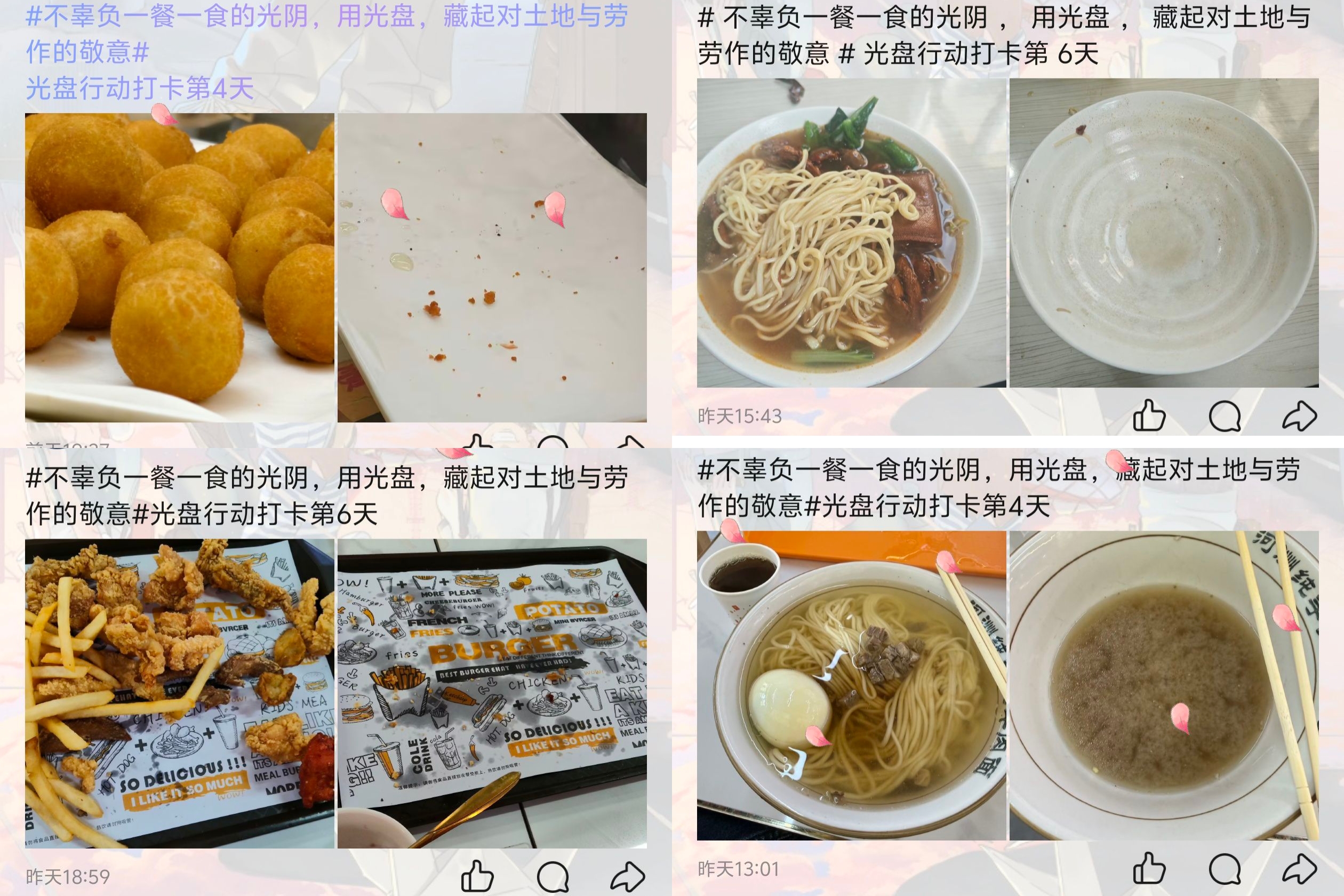 活动开展以来,参与人员通过“小程序打卡”的形式在每日就餐前、后各拍摄一张照片,记录用餐前后的光盘状态,然后在个人空间说说或朋友圈发布文案及照片。通过“餐前餐后拍照+固定文案分享”的打卡形式,将“光盘行动”从口号转化为每日可执行的具体行为,引导同学们在重复实践中养成按需取餐、杜绝浪费的用餐习惯,让节约粮食成为融入日常生活的自觉意识。