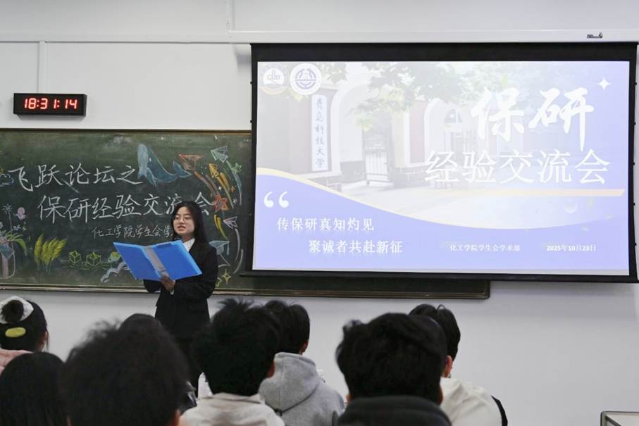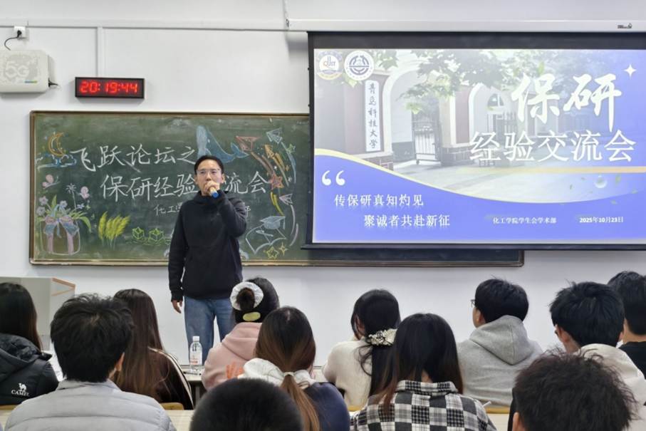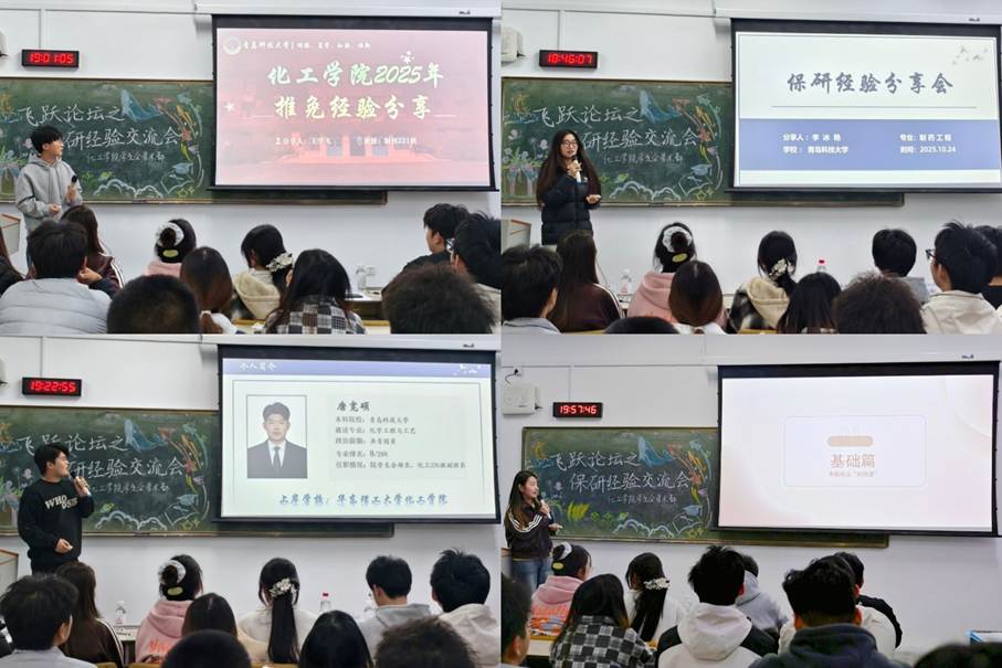 活动伊始,主持人介绍了本次交流会的目的与主要环节,现场气氛热烈。随后,来自化学工程与工艺专业的文鹏鹏、唐宽硕、卜文倩,制药工程专业的孙雨瑄、李冰艳,以及药物制剂专业的王学飞依次登台,围绕成绩规划、科研竞赛、英语备考、院校选择、面试策略等方面展开经验分享。他们结合自身经历,系统讲述了从积累科研成果到准备面试答辩的全过程,为同学们提供了可操作性极强的经验参考与方向指南。