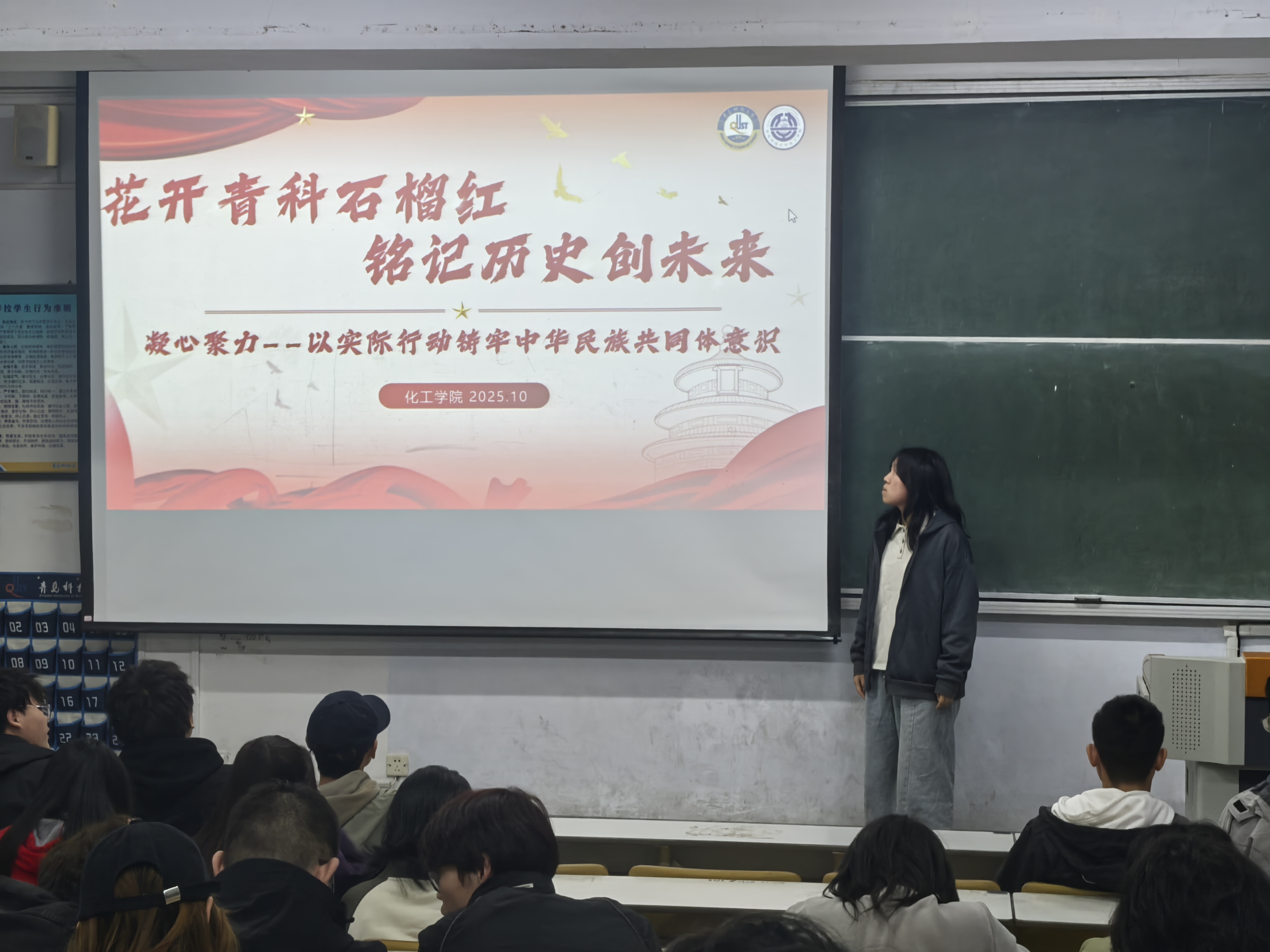 “花开青科石榴红 铭记历史创未来”主题班会。学院2024级、2025级各班级召开主题班会,通过组织全体团员观看了历史纪录片片段,共同回顾了艰苦卓绝的抗战历程。随后,同学们生动讲述抗战英烈的英勇事迹,深刻阐释了伟大抗战精神。在讨论中,同学们踊跃发言,结合自身实际探讨了新时代继承和发扬爱国主义精神的实践路径。
