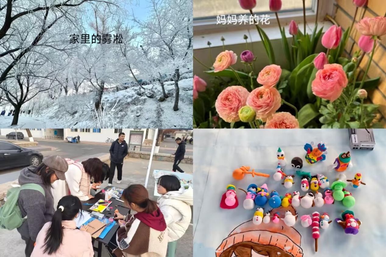 本次活动以线上和线下相结合的方式进行。线上“雪落时赠你一支冬”环节里,同学们在朋友圈或QQ动态分享“冬日花礼”的内容,或是新手制作的枯枝花束、冬日里的小盆栽,或是自带氛围感的冬日花景图。线下,色彩缤纷的橡皮泥整齐陈列,同学们化身“创意达人”动手捏制专属小雪人。指尖翻飞间,一团团柔软的橡皮泥被赋予生命。每一件成品都承载着同学们对冬日的感知、对生活的期许。