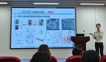 针对上述挑战,阚雨菲系统介绍了其团队在“共交联树脂增效改性”领域的创新研究工作。研究围绕可降解生物基胶粘剂的技术创新与成果转化,通过共交联树脂的结构设计与界面调控,实现了生物基复合材料力学性能、耐水性与稳定性的协同提升,为生物基材料在高端领域的应用提供了技术支撑。报告中重点展示了团队研发的高效低成本生物基胶粘剂,相关产品已实现规模化应用,充分展现了基础研究向产业转化的落地潜力。